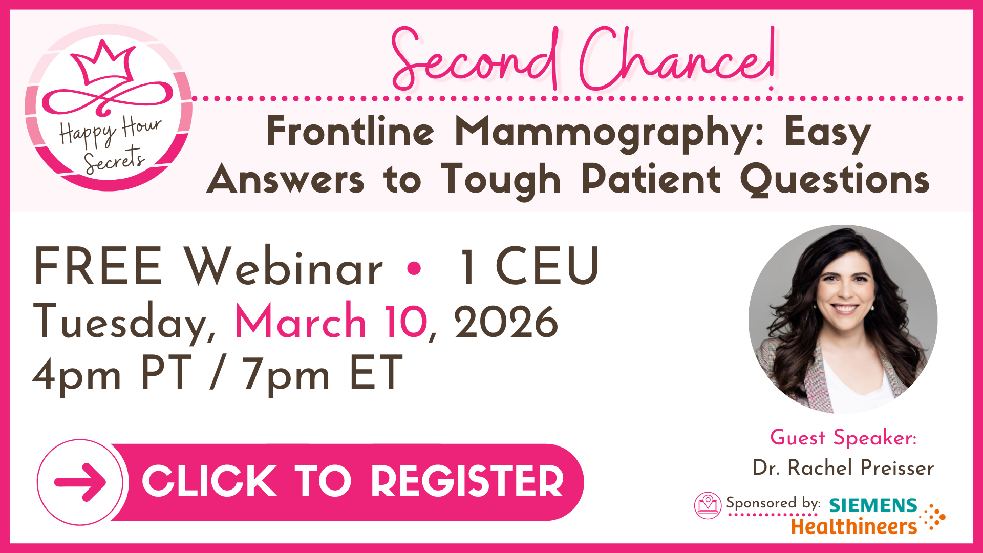 Thank you for attending the January 2026 Happy Hour Secrets webinar – “Second Chance! BI-RADS Demystified: 6th Edition Updates for Optimal Patient Care” on January 27, 2026.